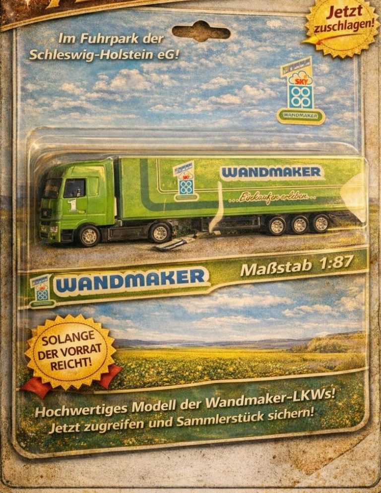 Detailgetreues Wandmaker LKW-Sammlermodell im Maßstab 1:87, inspiriert vom Fuhrpark der Schleswig-Holstein eG. Hochwertig verarbeitet, im charmanten Retro-Design verpackt.